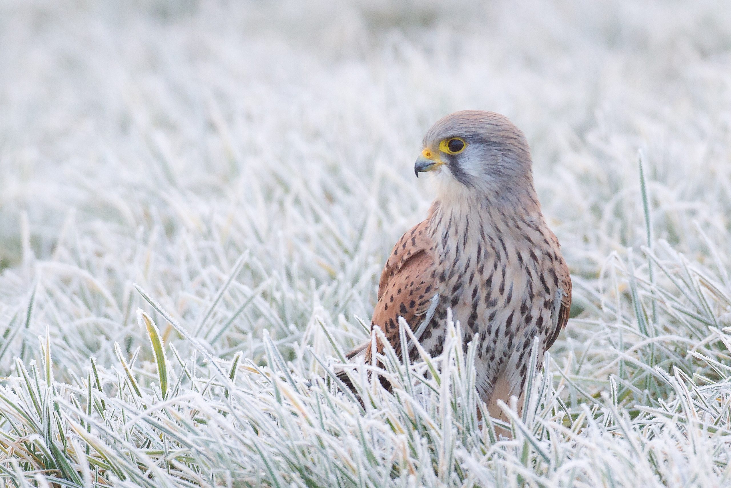 Het wit van de torenvalk gaat prachtig over in het wit van het berijpte gras.