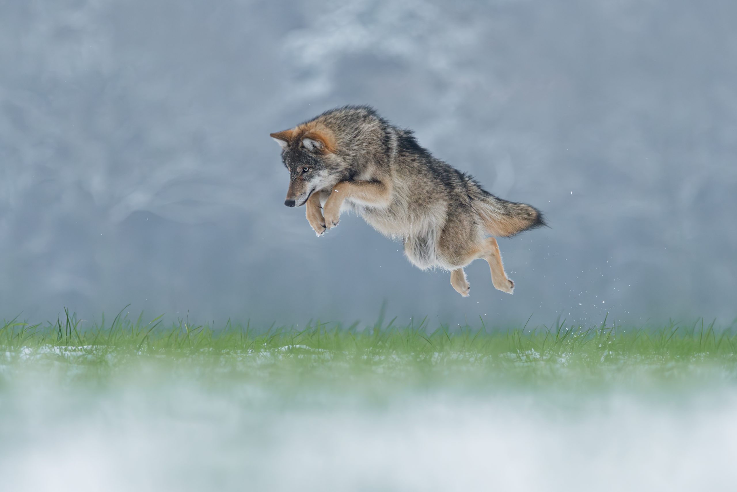 Het liep al tegen zonsondergang en plotseling kwam al jagend de jonge wolf steeds dichterbij. Ik nam een laag standpunt in – zoals ik altijd doe – liggend op de grond. De wolf drentelde wat heen en weer snuffelend op de grond, duidelijk op zoek naar muizen. Terwijl ik daar lag in de sneeuw en nattigheid met een handje fotografen liet de wolf zich goed zien en bleef maar sprongen maken om muizen te kunnen vinden. Pas na het fotograferen besefte ik hoe koud ik het had en dat al mijn kleding doorweekt was door de natte grond. Maar dat was het allemaal waard!”