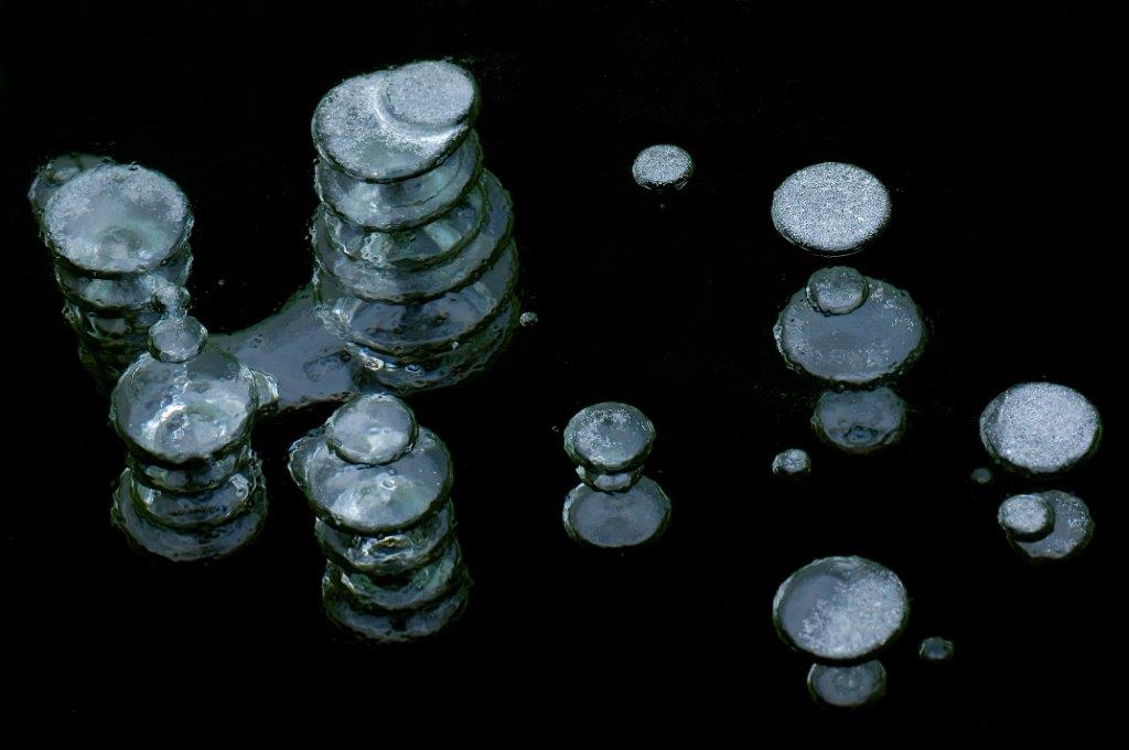 Vriest het de nacht erop weer, dan vormt zich ijs rond de luchtbel. En zo kunnen rijen met bevroren belletjes ontstaan. Het ijs wordt dan ook wel dubbeltjes-ijs genoemd.