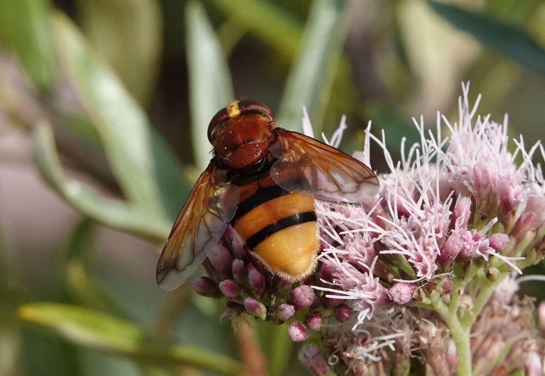 In de herfst verlaten alle wespen het nest: de werksters en de koningin gaan dood, mannetjes en jonge koninginnen vliegen uit om te paren, waarna ook de mannetjes sterven en de jonge koninginnen een overwinteringsplaats zoeken. De stadsreuslarven blijven achter om in het lege nest te overwinteren. In de volgende zomer verpoppen ze, waarna een nieuwe generatie stadsreuzen verschijnt. Nu dus. De volwassen vlieg is geregeld te vinden op de bloemen van berenklauw, koninginnenkruid en vlinderstruik, waar hij nectar en stuifmeel eet. Vooral in het zuiden en westen van Nederland. Bovendien loopt hun aantal op in zonnige, warme zomers met langdurige perioden van (zuid)oostenwind op. Dan vullen migranten uit zuidelijker streken de Nederlandse populatie aan. Wie weet zie je een dus een stadsreus in je tuin.