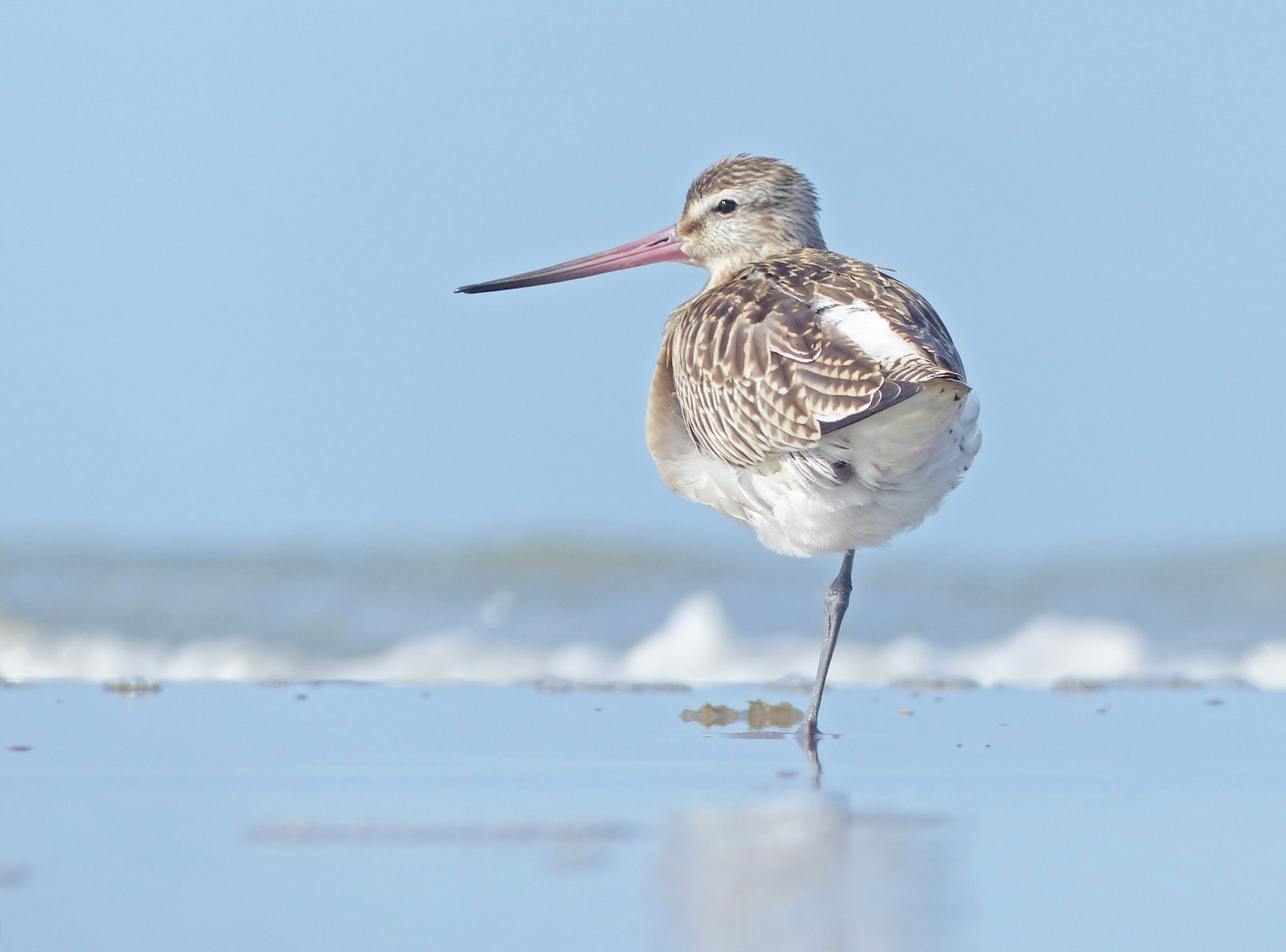Ik had geluk. Op deze ochtend eind september was het bijna windstil, er waren wat sluierwolken en het was laag water. En het was rustig op het strand. Ik zag ik de rosse grutto al snel staan, tussen een groep drieteenstrandlopers. Ik had nog geen idee hoe ik de foto zou maken, dat idee ontstond pas toen de drieteenstrandlopers een stukje verder gingen zitten en de grutto alleen stond.