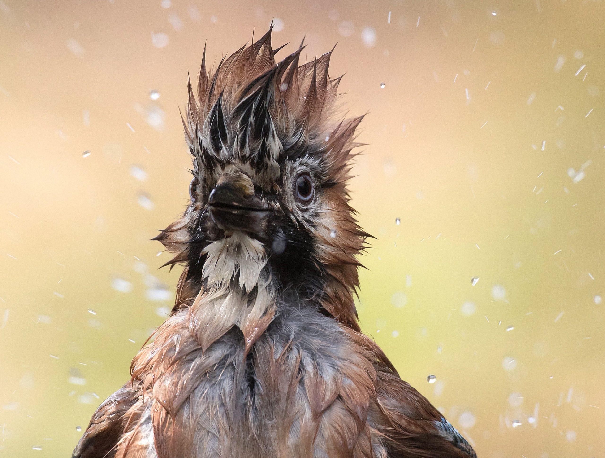 “Deze foto is gemaakt om 16.00 uur toen er wat tegenlicht was, dat gefilterd wordt door een grote eik naast de hut. Op dat moment kwam er een gaai badderen. En dat is altijd een heel koddig gezicht en vooral de kuif die ze dan hebben is zo komisch. Op het moment van badderen heb ik de snelle modus gebruikt zodat ik een hele serie achter elkaar kon schieten, waarvan ik deze de mooiste vind.”