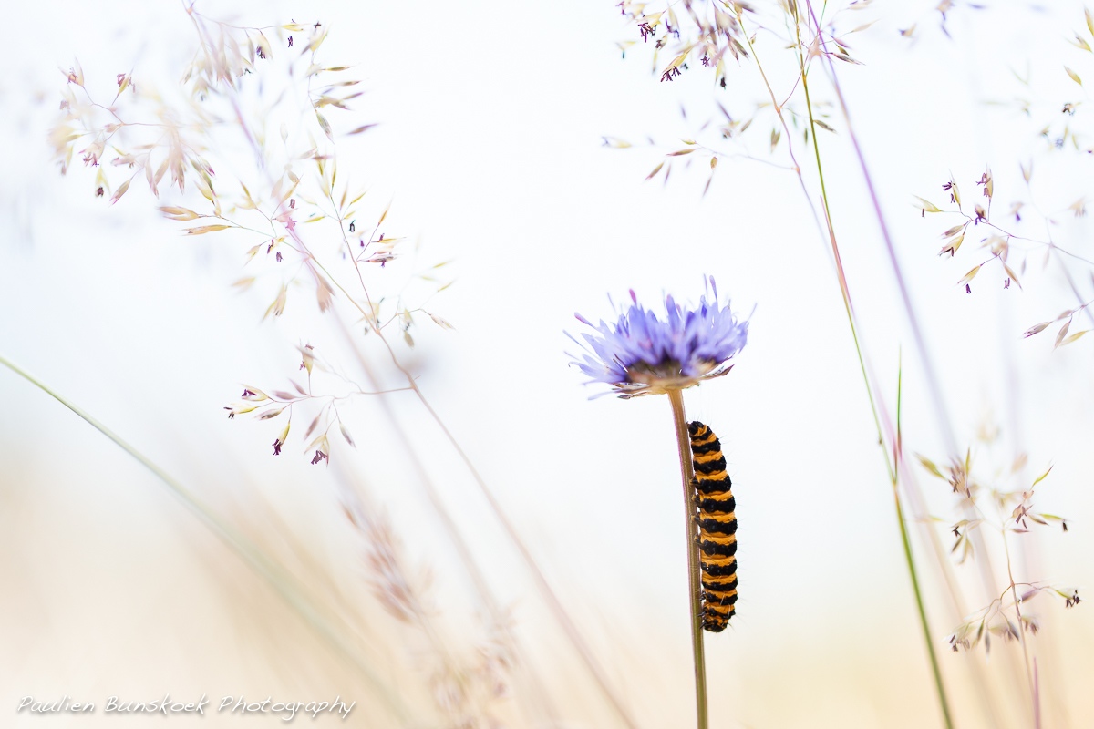 Een paar weken geleden was ik een paar daagjes op Texel. Tijdens een wandeling door de duinen kwam ik heel veel zebrarupsen tegen. Dit zijn de rupsen van de Sint-jacobsvlinder en ze zitten meestal op jacobskruiskruid. Eén rups had besloten om op een ander bloemetje te gaan zitten. Wat mij betreft een veel mooier bloemetje en het stond tussen een paar grasjes. Het was midden op de dag met vrij hard licht. Dus een uitdaging! Maar ik heb dit licht toch kunnen gebruiken om mooie zachte, high key foto’s te maken.